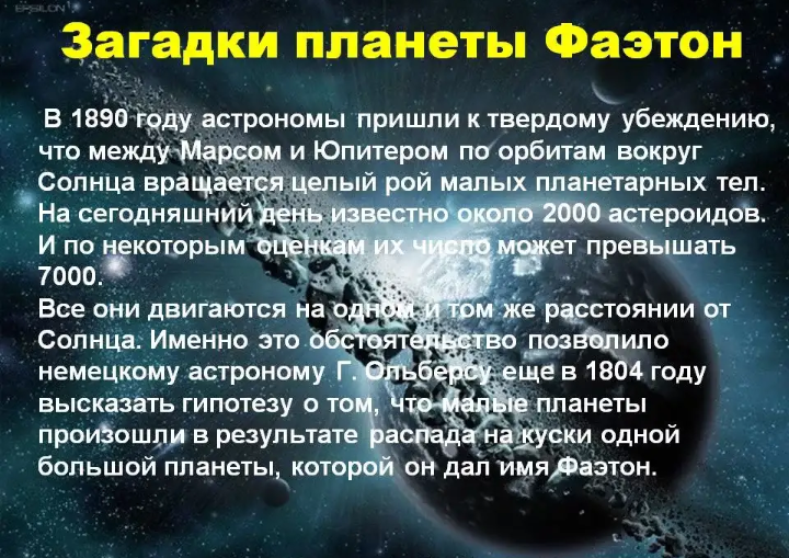 Считается, что планета Фаэтон была пятой планетой солнечной системы. Она располагалась между Марсом и Юпитером, ближе к поясу астероидов. Возможно там была жизнь и даже разумные существа, братья по разуму. Есть несколько вариантов как Фаэтон мог разрушиться на тысячи астероидов. То это всего лишь догатки и предположения ученых. Но это гипотеза очень сильно похожа на правду. Одна из версий как была уничтожена планета Фаэтон: считается, что Фаэтон располагался между Марсом и Юпитером, но ближе к Марсу и внутри пояса астероидов. И Юпитер своим чудовищно сильным притяжением притянул к себе Фаэтон и тем самым карликовая планета оказалась в эпицентре пояса астероидов. И именно поэтому Фаэтон был разрушен и раздроблен в мелкие частицы, тем самым став частью пояса астероидов. И за миллионы и миллиарды лет куски Фаэтона сточились и стали овалообразными космическими телами. Кто знает, если Фаэтон существовал и сейчас, то там скорее всего была бы жизнь!