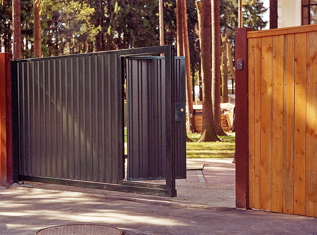 - Ширина калитки для забора из профнастила не должна быть более 1 метра. Проем такой ширины позволяет легко пронести любую крупногабаритную кладь, мебель. При больших значениях петли подвергаются быстрому износу, что приводит к перекосу полотна;