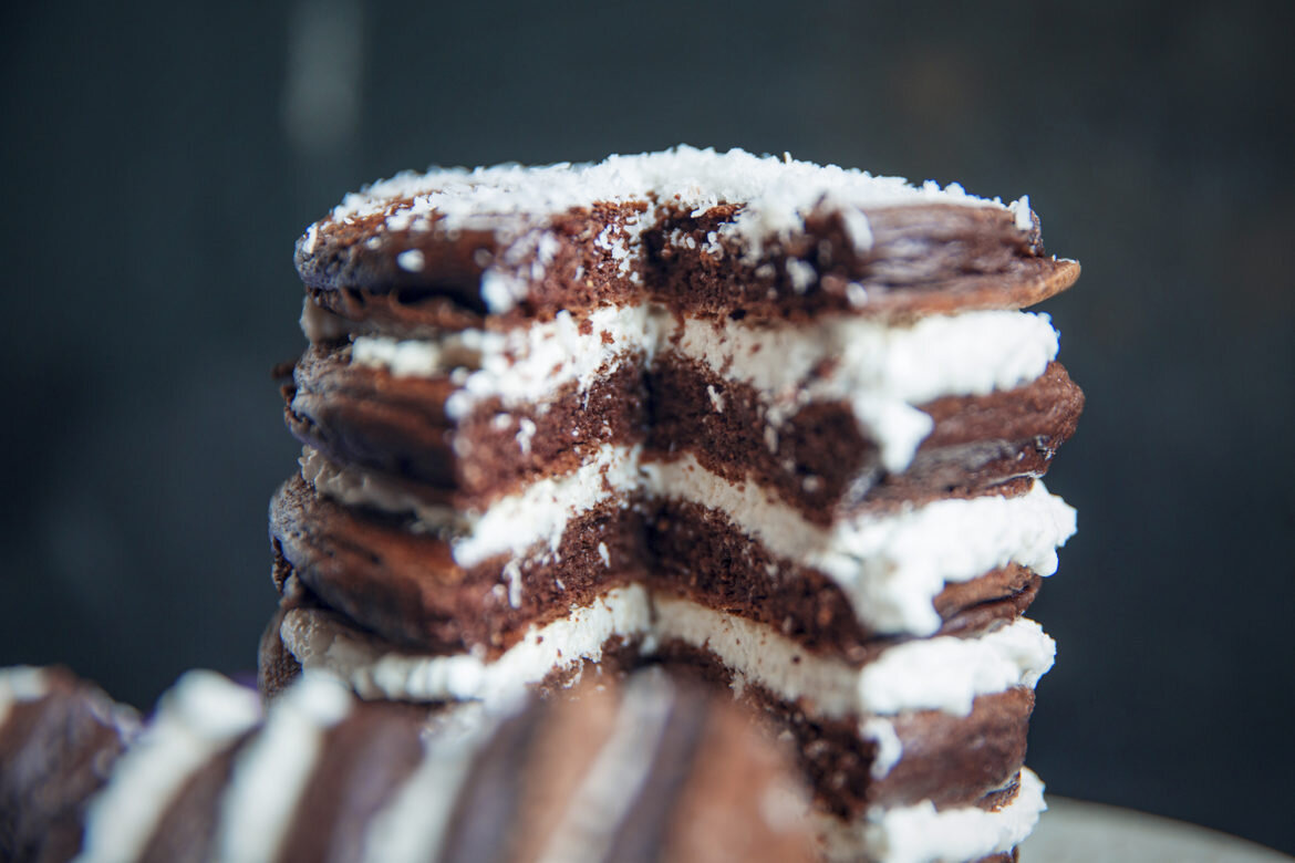 Если вы хотите что-то сладкое на завтрак, вы можете попробовать эти белковые оладьи - подходит для всех любителей фитнеса. Перейдём сразу к делу, а именно, к рецепту! Для приготовления теста 5-6 оладий "ОРЕО" нам понадобится: Для начинки: Мы формируем тесто для блинов, смешивая протертые овсяные хлопья, греческий йогурт, молоко, белок, соду, какао и яйцо. Тщательно перемешиваем смесь и даем ей постоять некоторое время. Как только сковородка достаточно нагреется, мы обжариваем на ней блины с обеих сторон, пока они не будут готовы. Из указанного количества продуктов мы получим 6 относительно крупных блинов. А пока мы смешиваем сливки из обезжиренного творога и тертого кокоса, через которые переводим наши Орео-блины. Приятного аппетита.