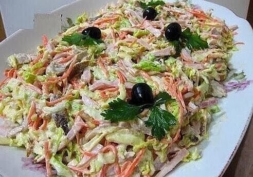 Ингредиенты: - Ветчина вареная - 300 г - Курица (грудка отварная) - 1 шт - Капуста пекинская (небольшой кочан) - 1 шт - Морковь по-корейски - 200 г - Майонез - 100 г -Орехи - 1 горсть. - яичные блинчики - 3 яйца взбиваем с небольшим количеством молока и муки. Жарим 2 блинчика. Способ приготовления: Пекинскую капусту шинкуем, складываем в салатник. Ветчину режем длинными полосочками . Куриное филе и ветчину нарезаем соломкой . Яичные блинчики нарезаем соломкой. Орехи измельчаем. Все ингредиенты перемешиваем и заправляем майонезом. Приятного аппетита и хорошего Вам настроения! Если вам понравился рецепт, дайте знать, нажав на палец вверх, и не забывайте подписываться на канал, Готовьте с удовольствием!