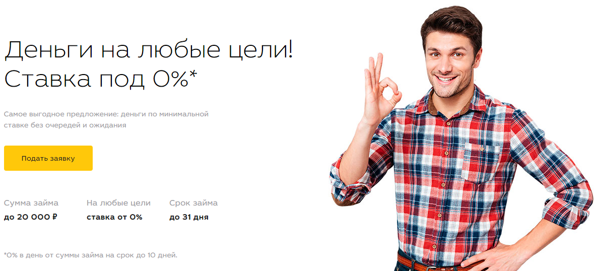 WEBBANKIR Деньги на любые цели! Ставка под 0% Самое выгодное предложение: деньги по минимальной ставке без очередей и ожидания Сумма займа - до 20 000 ₽ На любые цели - ставка от 0% Срок займа - до 31 дня Залог и поручительство - Отсутствуют Необходимые документы - Паспорт гражданина РФ Требования - Возраст от 20 лет Заявка Оформление срочного займа на карту онлайн начинается с заполнения заявки. Укажите сумму и срок возврата. Получить деньги можно круглосуточно, заявки принимаются в любое время Одобрение Быстрые займы на карту одобряются в течение 10 минут. Процент отказов в компании Webbankir минимальный. Повторные заявки на займы денег одобряются в 95% случаев Деньги Заёмщик получит займ на карту сразу же после одобрения заявки и подписания договора простым кодом из смс. Возьмите деньги на любые цели: погашение кредита, оплату покупок и срочные нужды Способы получения денег, если вы не новый клиент: · Qiwi · Visa · Мир · Contact · Яндекс кошелёк · Mastercard Способы получения де