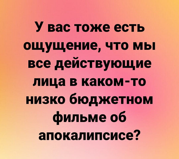 Такое чувство, что Армагеддон пришёл в гости к Апокалипсису по бухать!Воображение подсказывает, чем могут закончиться эти посиделки, хотя очень хочется надеяться на счастливый хэппи энд.Как говорится, такова селяви... Если кто-то не понял, то я о карантине и о ситуации в мире!Представьте, чем может закончиться весь этот марлезонский балет, если нам впарят и вторую его часть! Практически во всех странах, кроме дефицита медицинских масок, существует и дефицит патронов! ПАТРОНОВ, МАТЬ ЕГО !!! Это говорит о том, то все, кто имеет легальное оружие запасаются патронами! А через них запасаются патронами и владельцы нелегального оружия (друзья, знакомые,родственники и т.д.)! Если допустить мысль, что развитие событий в мире пойдёт по наихудшему сценарию, то кроме патронов,мыла,макарон,гречки и туалетной бумаги луди начнут скупать луки,стрелы,арбалеты,топоры,ножи и прочий "холодняк"! А сколько всплывёт незаконно хранящегося и самодельного огнестрела... В случае голода народ повалит из городов