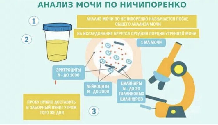 Анализ мочи по Нечипоренко. Пробу по Нечипоренко анализируют на полуавтоматическом лабораторном оборудовании. То есть для подсчета клеток или веществ лаборанту требуется только вставить пробирку внутрь анализатора. Прибор произведет исчисления сам. Метод применяют при: Несмотря на то, что для проведения исследования необходим 1 мл жидкости, для анализа человек должен собрать около 20 мл от количества мочи. После получения образца врач-лаборант перемешивает его, чтобы клетки и вещества не выпали в осадок, отливает 1 мл урины в небольшую пластиковую пробирку. Ее помещают внутрь анализатора, который распечатывает результат. Перед расшифровкой результатов пациент предупреждает врача о применяемых лекарствах, физиологическом состоянии (например, беременности), диете (белковый рацион увеличивает число цилиндров). Все эти причины меняют параметры состояния мочи, если пациент не предупредил о них врача, он поставит диагноз, которого нет, и будут проведены ненужные методы лечения. Подготовк