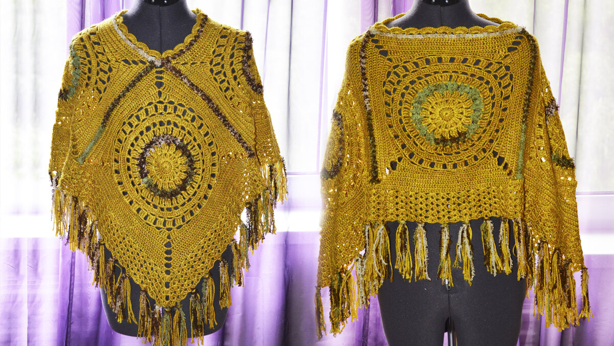 Вязаное пончо из бабушкиного квадрата крючком.