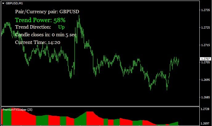 Табло содержит информацию о наименовании валютной пары, силы тренда, направлении тренда и о времени окончания текущей свечи, а также время по брокеру. Сам индикатор подходит для торговли всего по четырём парам – это евродоллар, фунтдоллар, доллариена и фунтиена. На первый взгляд, выборка довольно стандартная, выбивается из ряда только фунтиена, ведь пара самая волатильная на рынке. Но, поскольку индикатор не перерисовывается, можно посмотреть на историю и увидеть, что по этой паре он даёт достаточно точные сигналы и вполне пригоден для использования.