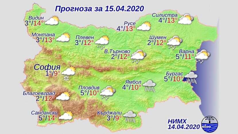 Ночью будет дуть умеренный до сильного северо-западный ветер, с которым в страну продолжит поступать холодный воздух. Будет облачно с дождем. Минимальная температура будет между 0° и 5°. Днем с северо-запада осадки начнут прекращаться, а облачность уменьшаться. Максимальная температура будет между 9° и 14°... Прогноз погоды в Болгарии на 15 апреля
