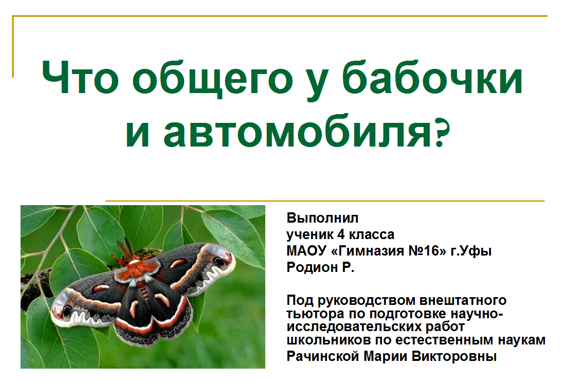 Уважаемые читатели, вашему вниманию предлагается обзор научно-исследовательской работы ученика 4 класса на тему "Что общего у бабочки и автомобиля?" Мир насекомых - такой близкий к человеку, и такой загадочный. Они всегда рядом с нами, но их тайны так и остаются неразгаданными. О них сказано: "Насекомые. Они – истинные хозяева земли. Их – миллиард миллиардов, больше, чем звёзд в нашей галактике..." Учёными описано более миллиона видов насекомых. Они очень разнообразны, и большинство их видов мало изучено. Насекомые заселяют все климатические зоны. Самые крупные известные насекомые превосходят самых мелких в полторы тысячи раз. Лишь малая часть насекомых наносит вред человеку. В большинстве своем насекомые играют важнейшую роль в природе, а также, в жизни человека. Стоит упомянуть такие необычные способы использования как кулинарная экзотика и "живые украшения". Организм насекомых - это крохотная, но очень сложная инженерная конструкция и богатая лаборатория. В основе при