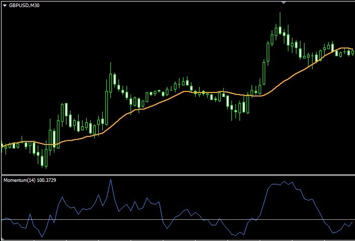 Довольно простая стратегия, которая применяется на паре британский фунт к доллару. Для других пар стратегия не подходит, так как рассчитана на волатильное поведение, которое как раз и отличает английскую валюту. Для торговли нам потребуется наложить на график простую скользящую среднюю с периодом 20, а также индикатор из группы осцилляторов Momentum с периодом 5. На самом моментуме наносится горизонтальная линия с параметром 100. Это середина диапазона, и торговля будет вестись в зависимости от положения линии моментума по отношению к этому срединному уровню.