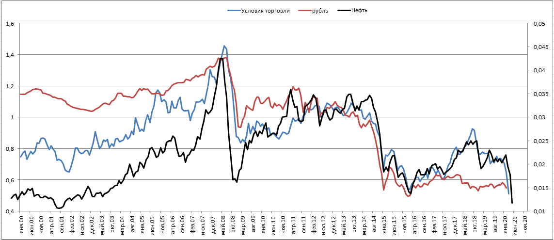Модель, построенная согласно теории УТ нанесена, синей линией. А вот теперь самое интересное, черная линия – это динамика цен на нефть. Это достаточно сильная корреляция между «условиями торговли» и ценами на нефть, которые максимально плотно копирует динамика курса рубля в косвенном выражении (RUB/USD) – это, как Вы догадались - красная линия. Именно косвенный способ отображения валютного курса мы будем использовать на протяжении статьи.
