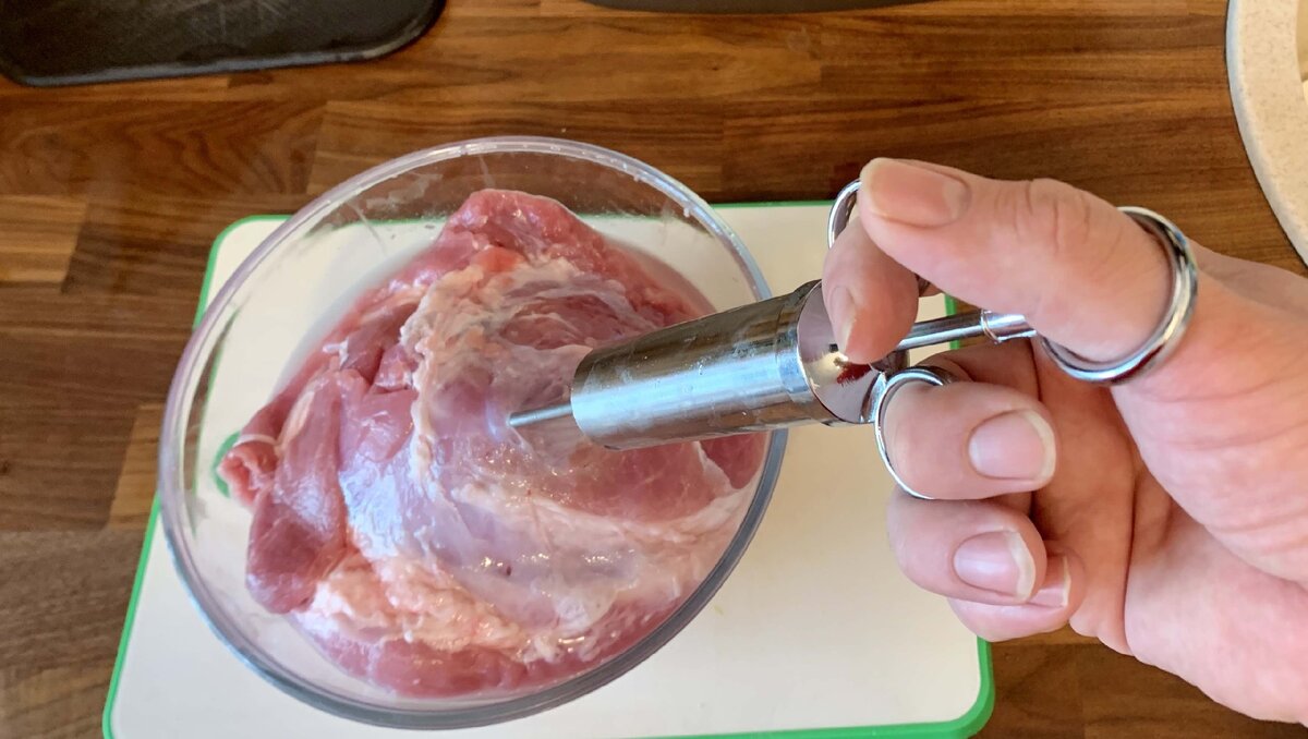 Берем кусок свинины (у меня окорок) и примерно 20 % воды, для ровного счета я взял 300 мл. От общего веса берем 2% воды и я взял 1% сахара. Сахара можно взять меньше, не половину от веса соли, а треть или даже четверть. Растворяем и накалываем в мясо. У меня профессиональный инъектор, который я купил в магазине Емколбаски, но можно использовать обычный шприц. Это дольше, но вполне возможно, т.к. соль и сахар полностью растворяются и игла не засоряется. Если не хотите накалывать можно просто поместить в рассол, но его необходимо будет приготовить больше. Расчет соли такой же - 2%. Выдерживать без шприцевания надо сильно дольше, до недели, так что лучше нашприцевать.