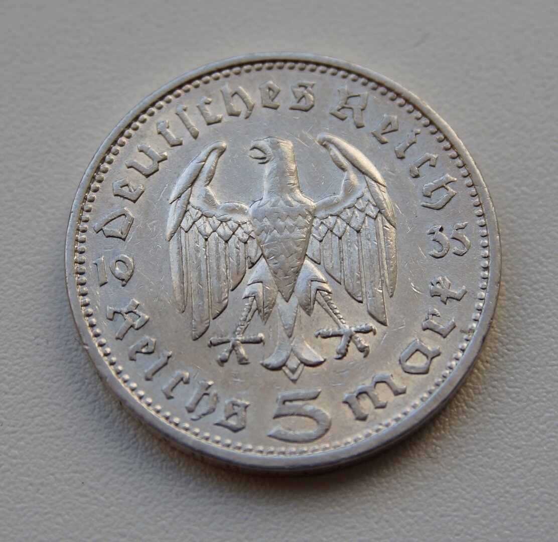 5 рейхсмарок с изображением Гинденбурга — серебряная монета, которую чеканили в Третьем рейхе с 1