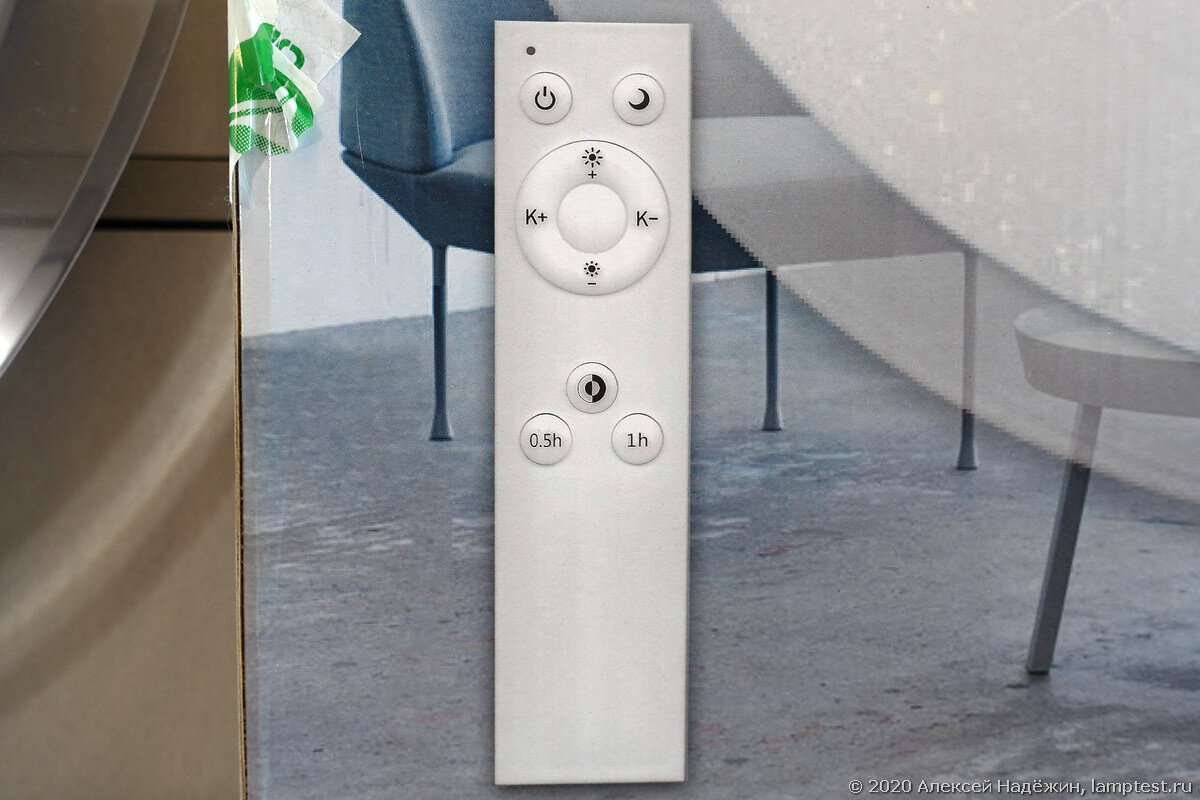 В комплекте идёт пульт с 9 кнопками. Ко мне светильник попал без пульта, поэтому привожу фото с коробки.