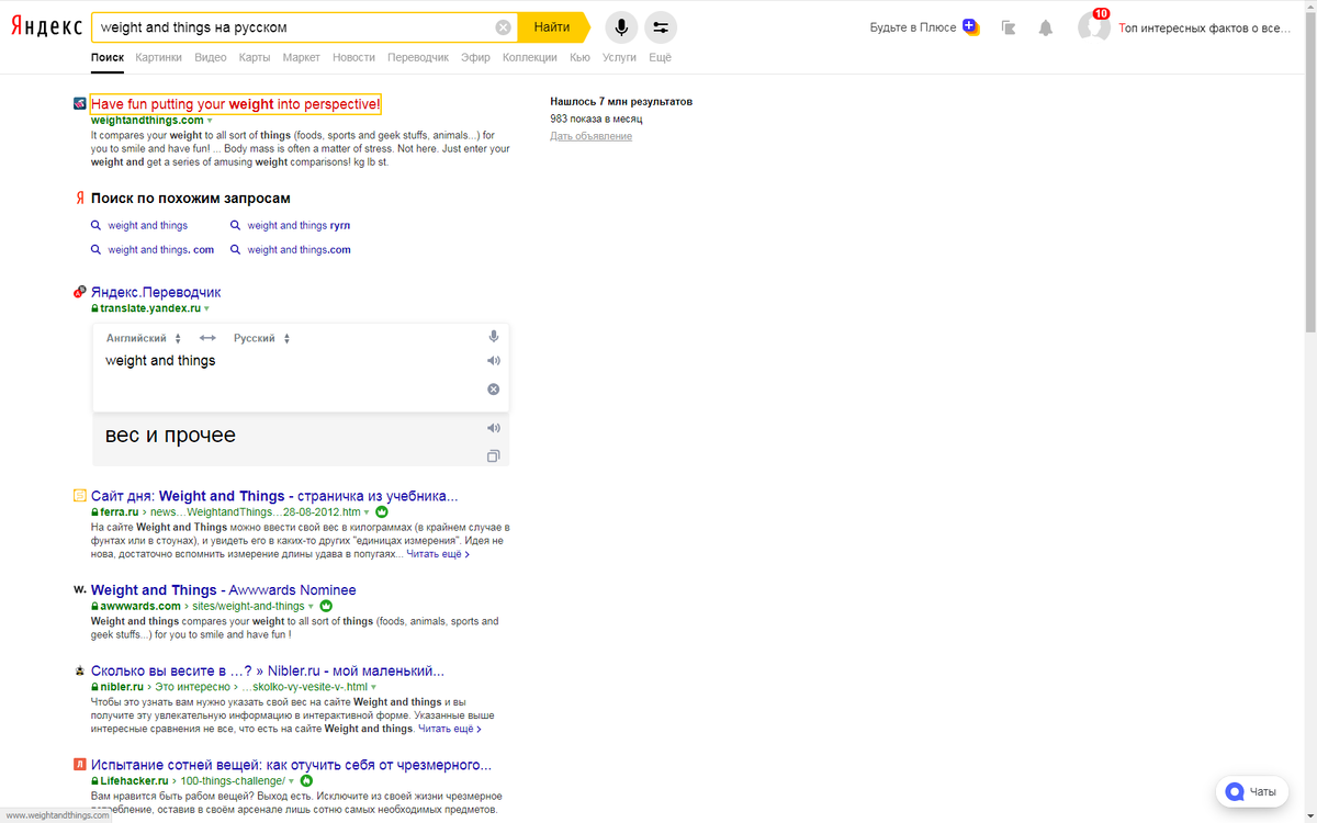Всем доброго времени суток.Сегодня мы с вами поговорим о том о чем вы и не догадывались в гугл.Я нашел еще одну фишку при которой вы сможете узнать много чего нового.переходим в гугл или любой другой браузер.(эта фишка действует со всеми браузерами).И пишем weight and things.Переходим по первой ссылке. Далее в эту ячейку пишем свой вес.Например я вешу 45 дальше нажимаем 'go'