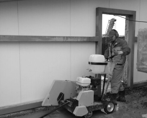 - Вырезанный бетон режется на более мелкие куски для более простого удаления из помещения.