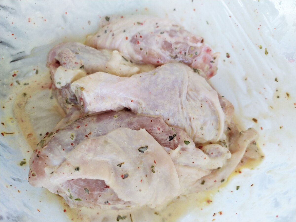 1. Курицу мариную в майонезе, добавляю орегано, базилик, чеснок,соль и перец, поливаю оливковым маслом - примерно 2 ст.л. Все перемешиваю и оставляю мариноваться (у меня курица стояла ночь) вы же можете оставить на столько, сколько позволяем время. 2. Картофель режим дольками 3. В картофель добавляем соль, перец, розмарин. Можно добавить майонез. 4. Все хорошенько перемешиваем, а затем смешиваем с курицей