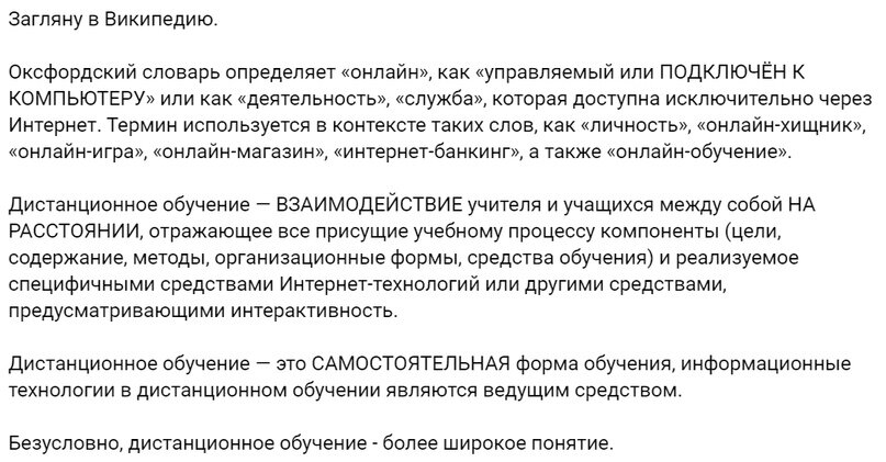 Дистанционное обучение есть процесс, а онлайн есть маленький кирпичик процесса.