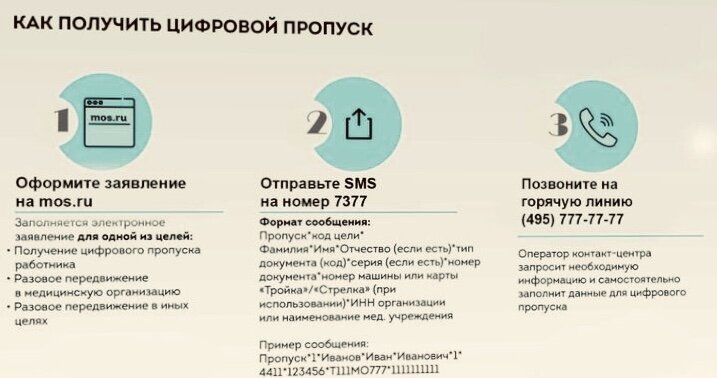 Данная инструкция для *на работу на машине* 1. Слово «Пропуск» 2. Цифрой - код цели, то есть то, для чего вам нужен пропуск (1 - для работающих) 3. Цифрой - тип паспорта (1 - паспорт гражданина РФ; 2 - иностранный паспорт; 3 - другой документ) 4. Серия паспорта (если есть) 5. Номер паспорта 6. Номер транспортного средства, если поедете на машине или мотоцикле (если этого нет, ничего не пишем) 7. Номер карты «Тройка», если у вас есть (если не используете для этой поездки, ничего не пишем) 8. Номер карты «Стрелка», если у вас есть (если не используете для этой поездки, ничего не пишем) 9. ИНН организации. Если человек работает в медицинском учреждении, ИНН сообщать необязательно. 10. Краткое название организации, где работаете. Важно! После каждого пункта ставим звездочку. Сообщение пишем без пробелов. Например, чтобы получить пропуск для поездки на работу на машине, сообщение должно выглядеть так: Пропуск*1*1*5022*456123*Р043МП177***1234567890*ООО «Ромашка»