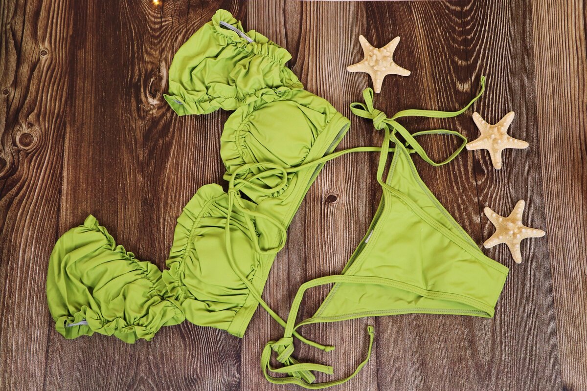 Крой лифчика замысловатый - похож на кроп-топ с большим количеством рюшей.