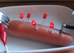 Зачищаем провода, прикручиваем или припаиваем к ним крокодильчики. Втыкаем вилки в торцы сосиски, и на каждую вилку вешаем крокодильчик. Разумеется всё должно быть на сухом, диэлектрическом покрытии. Идеально подходит обычная кухонная тарелка, протёртая полотенцем. Убираем детей, домашних животных,тёщу, жену (нужное подчеркнуть) из комнаты. Отходим подальше от сосиски, малоли что. Ещё ра