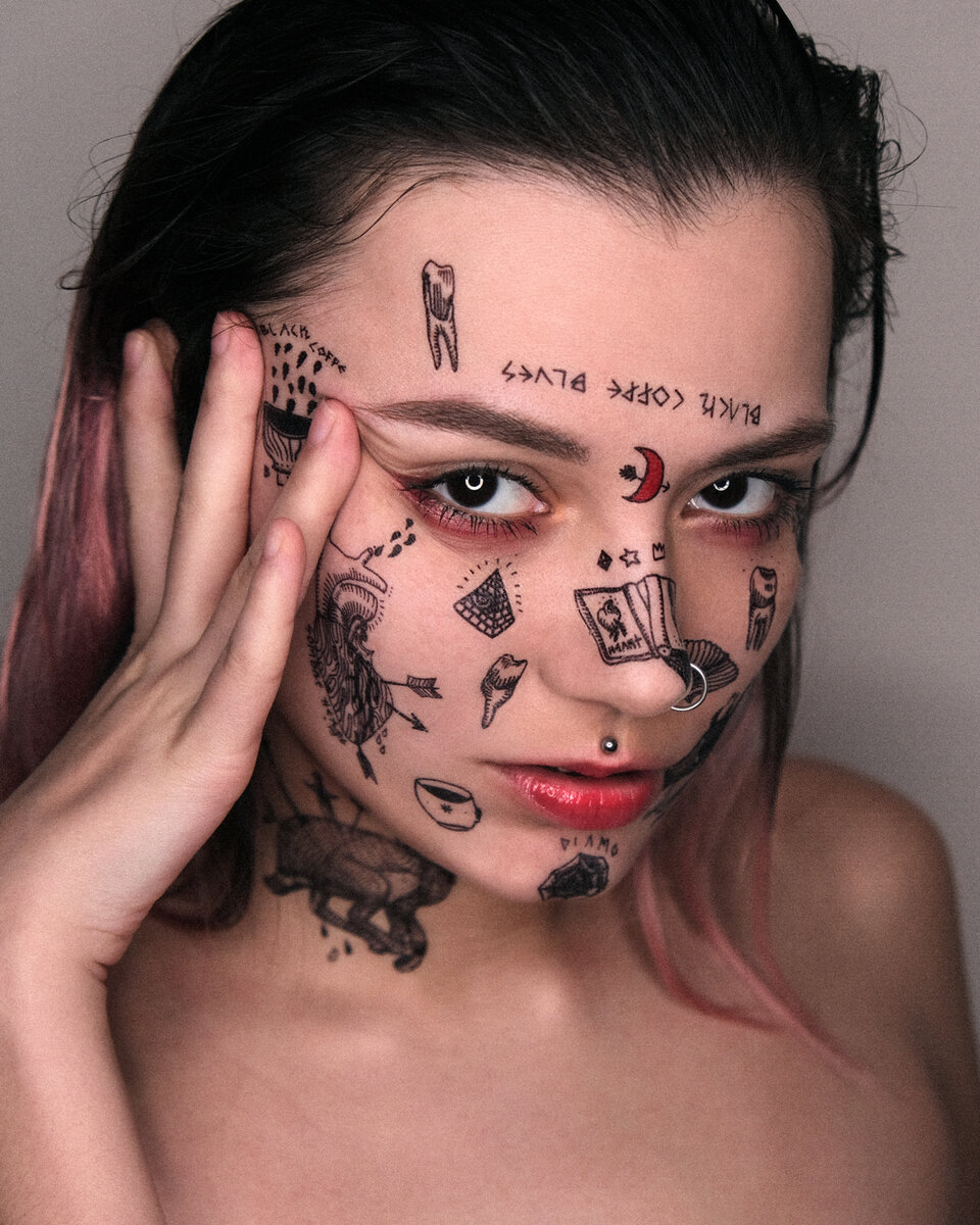 Я уже писала статью о том, что у меня очень много переводных тату, которые я очень часто использую для своих фотографий. Чаще всего они гармонично вписываются в образ, но сейчас мне захотелось сделать немного треша)) Я понимаю, что такое фото смотрится довольно крипово, но в этом что-то есть, как мне кажется. О, и кстати, это фото без парика, со своими волосами, хоть и мокрыми (я их уже больше месяца не подкрашиваю, ибо розовая краска стоит немало, а какой смысл ее тратить, когда целыми сутками сидишь дома).