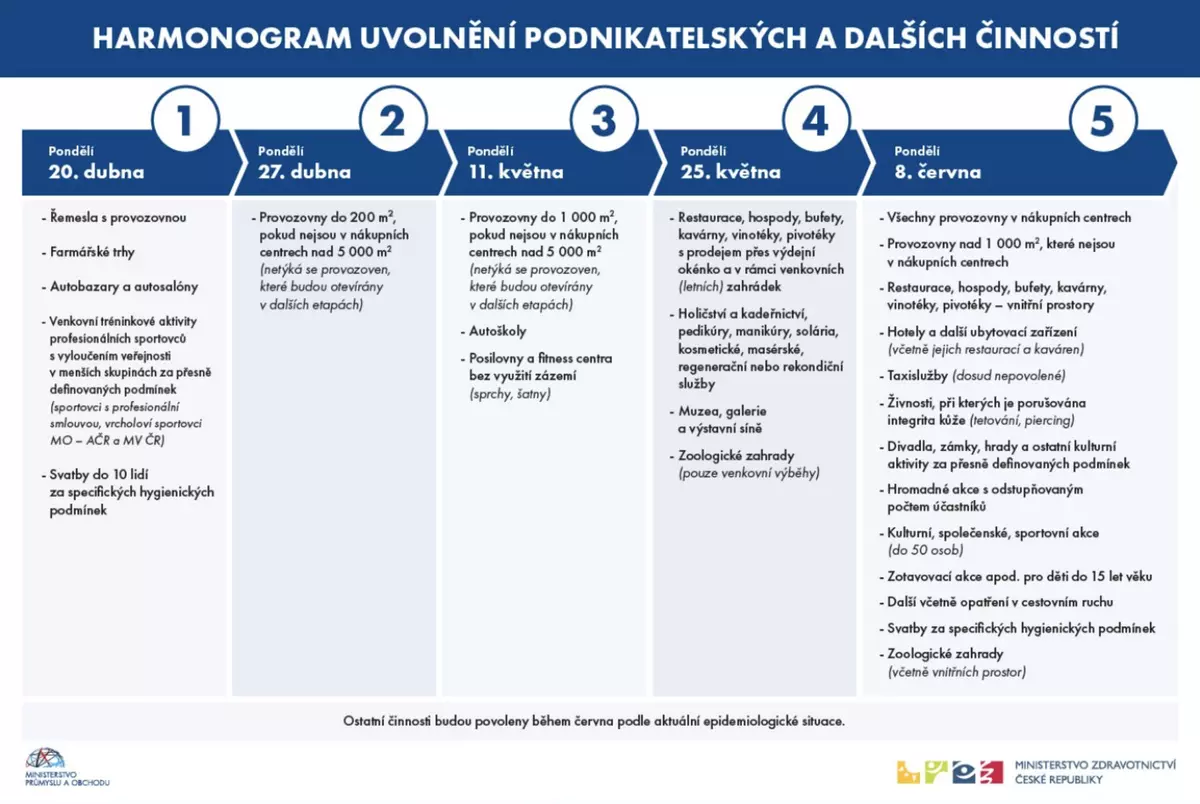 Как долго ещё будет действовать карантин в Чехии? Когда заработают рестораны, музеи, замки? А также заявления министра здравоохранения об открытии границ. План на ослабление мер разделили на пять этапов с 20.04 до 08.06 Больницы постепенно будут возобновлять плановые обследования и операции, оставляя часть помещений для заражённых covid-19. 1 этап. 20 апреля. Начнут работу фермерские рынки, автосалоны, мастерские, разрешены уличные мероприятия для профессиональных спортсменов без зрителей, могут вернуться к занятиям в ВУЗах студенты (с ограничениями). Разрешено проведение свадеб до 10 чел. 2 этап. 27 апреля. Разрешено открыть магазины до 2500 м2 (раньше - 200 м2), кроме тех, что в торговых центрах площадью свыше 5000 м2. 27 апреля (раньше - 11 мая.) Открываются торговые помещения до 1000 м2, если они не в ТЦ свыше 5000 м2 (с исключениями). Например, примерочные кабинки будут закрыты. Разрешено открыть фитнесс-центры, спортклубы, но без пользования гардеробными и душевыми. Возобновля
