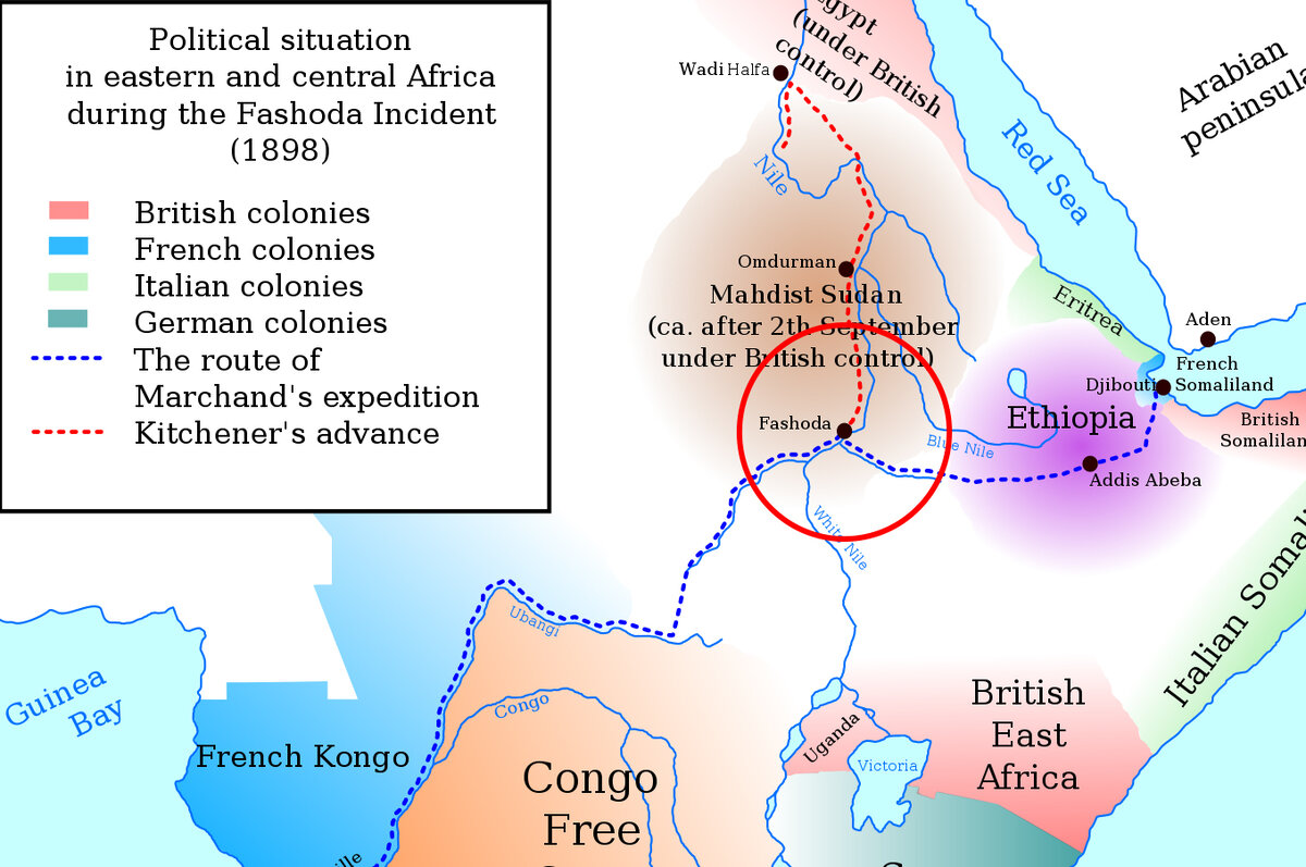 К концу XIX века Африканский континент был практически полностью поделён между Европейскими странами, но ещё оставались небольшие клочки, за которые колониалисты вели ожесточённую борьбу. Речь пойдёт о том случае, когда Франция и Великобритания оказались на пороге войны в 1898 году, известном также как Фашодский кризис. Англичане обладали довольно обширными территориями вдоль Нила, данную реку они воспринимали как свою, ведь вдоль неё осуществлялась британская мечта об империи от Александрии до Кейптауна. Существенно ослабило влияние британцев в Судане - восстание махдистов, которое продлилось с 1881 по 1899 года. В июне 1898 года французская экспедиция отправляется в устье Нила (на территории Судана), чтобы там закрепиться. Достигнув цели - небольшого поселения Фашода, экспедиция заняла старый обветшалый форт, но уже в сентябре к нему приблизились английские войска, которые стали настойчиво требовать увода французский войск. Французское правительство не могло пойти на риск войны