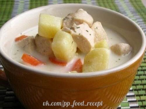 Сырный суп с курицей и плавленым сыром. На 100 грамм - 48.54 ккал Б/Ж/У - 5.86/1.25/3.17 Ингредиенты: - 400 гр куриного филе - 2 картофелины - 1 крупная морковь - 180 гр плавленого сыра - 2 литра бульона или воды - Зелень - Лавровый лист, душистый перец горошком - Соль, перец Приготовление: Куриное филе порезать кубиками средней величины. Картофель и морковь почистить. Картофель порезать кубиками, морковь – полукольцами. Филе слегка обжарить на сковородке с небольшим количеством оливкового масла. Бульон довести до кипения, положить лавровый лист и душистый перец и добавить кубики филе. Убавить немного огонь и варить 7-10 минут. После чего добавить овощи и варить еще 10-15 минут. Выложить в суп плавленый сыр, хорошо размешать, чтобы сыр полностью растворился. Добавить соль и перец по вкусу. Мелко порубить зелень и всыпать в суп. Размешать и снять с огня. Приятного аппетита!