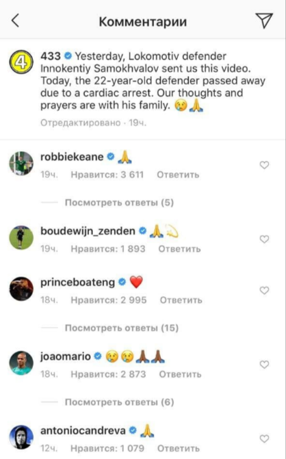 Робби Кин, Зенден, Боатенг, Кандрева и Мариу выразили соболезнования в связи со смертью защитника «Локо» Самохвалова