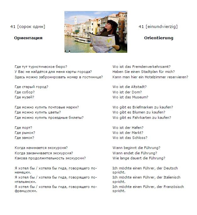 Немецкий язык. Урок 1. Немецкий язык. Урок 40. Добрый день! Продолжим изучение немецкого языка. Немецкий язык. Урок 41. 41 (сорок один) - 41 (einundvierzig) Ориентация - Orientierung Где тут туристическое бюро? - Wo ist das Fremdenverkehrsamt? У Вас не найдётся для меня карты города? - Haben Sie einen Stadtplan für mich? Здесь можно забронировать номер в гостинице? - Kann man hier ein Hotelzimmer reservieren? Где старый город? - Wo ist die Altstadt? Где собор? - Wo ist der Dom? Где музей? - Wo ist das Museum? Где можно купить почтовые марки? - Wo gibt es Briefmarken zu kaufen? Где можно купить цветы? - Wo gibt es Blumen zu kaufen? Где можно купить проездные билеты? - Wo gibt es Fahrkarten zu kaufen? Где порт? - Wo ist der Hafen? Где рынок? - Wo ist der Markt? Где замок? - Wo ist das Schloss? Когда начинается экскурсия? - Wann beginnt die Führung? Когда заканчивается экскурсия? - Wann endet die Führung? Какова продолжительность экскурсии? - Wie lange dauert die Führung? Я хотел бы / хот