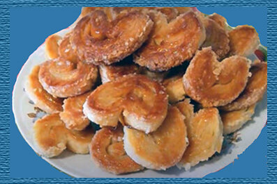 Нам понадобится тесто и сахар. Тесто раскатываем в пласт, посыпаем сахаром и загибаем края к середине, ещё раз посыпаем сахаром и опять складываем края к середине. Теперь складываем пополам и разрезаем поперёк на кусочки примерно 1,5 см. Укладываем одной из плоских сторон на противень, смазанный маслом. Выпекаем до золотистой корочки примерно 10–12 минут при температуре 180 градусов, переворачиваем и печём ещё примерно 7 минут. Когда вытаскиваем из духовки, сразу снимаем с листа.