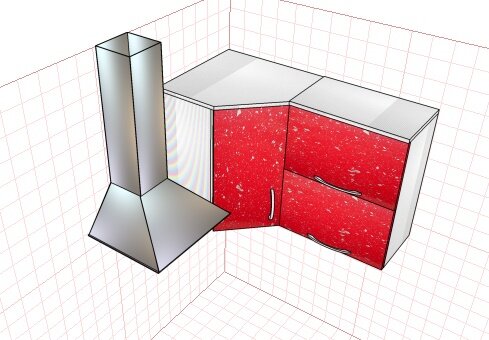 Самая частая ошибка - это размещение выступающей купольной вытяжки вплотную к угловому шкафу. Выступающая часть не даст открыться дверце полностью - при открывании вам будет доступна узкая щель под 45гр.