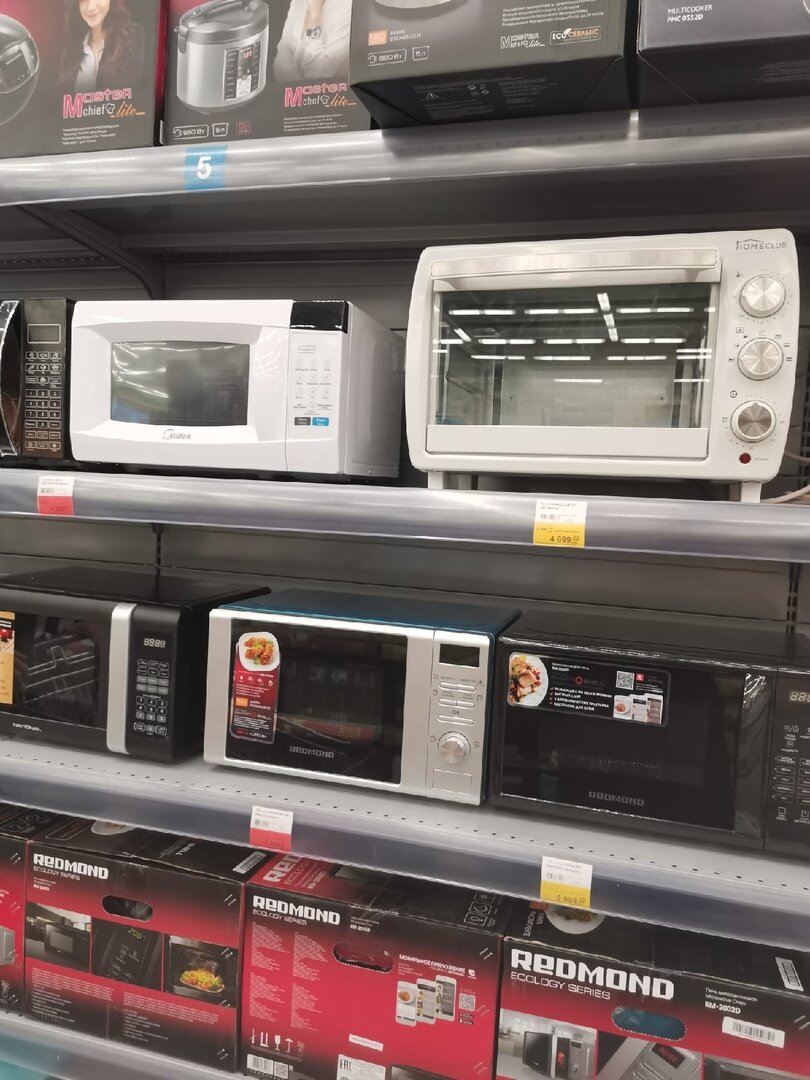 Так уж получилось, что совсем не вовремя у нас сломалась микроволновая печь - причем сломалась она так, что ремонт обойдется дороже, чем она стоила изначально, поэтому мы приняли решение, что не будем пытаться вернуть ее в исходное состояние, а отправимся покупать новое. Для меня покупать технику онлайн, не увидев ее в магазине - это самое неудобное занятие, поэтому я хотела найти хоть один работающий магазин, где можно вживую оценить предстоящую покупку. Сразу вспомнили, что в крупных гипермаркетах всегда есть мелкая бытовая техника, еще и скидки бывают, поэтому поехали в "Ленту". И не прогадали - сейчас как раз проходит распродажа, где можно прикупить все необходимое. Причем меня настолько впечатлил выбор, где была представлена не только стандартная в моем понимании техника, но еще и некоторые "диковинки", что я решила написать обзор именно на эту тему. Посмотрим с вами товары, цены и поделимся своим мнением на этот счет. Первая подборка с техникой выглядит так: Как раз то, что я и и
