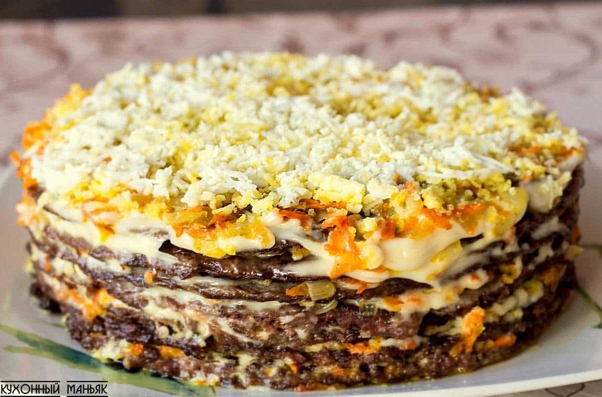 Выкладываем на коржи слой майонеза, лук с морковкой и посыпаем зеленью. Так, шаг за шагом, формируем торт. Когда он полностью будет собран, верхушку украсьте морковкой, зеленью. Торту необходимо выстоять пару часов в холодильнике, лишь потом его рекомендуется подавать к столу.