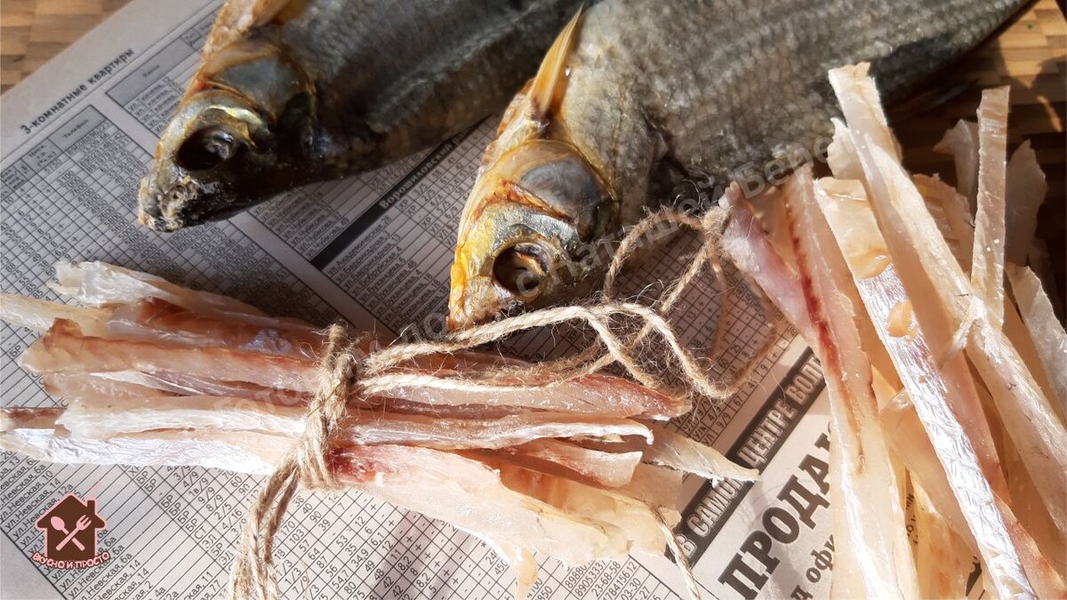 Готовим смесь из соли и сахара в соотношении 1:1. Каждый кусок филе хорошо обсыпаем смесью и укладываем в глубокую миску. Накрываем тарелкой и оставляем на 2 часа при комнатной температуре. Спустя 2 часа сливаем образовавшуюся жидкость. Снова накрываем тарелкой и ставим груз. Оставляем мариноваться рыбу еще на 4 часа. Спустя 4 часа обмываем филе под проточной водой от соли и сахара (можно этого не делать, если любите посолонее), нанизываем на крючки и вывешиваем в проветриваемое помещение (например балкон) на 1-2 суток.