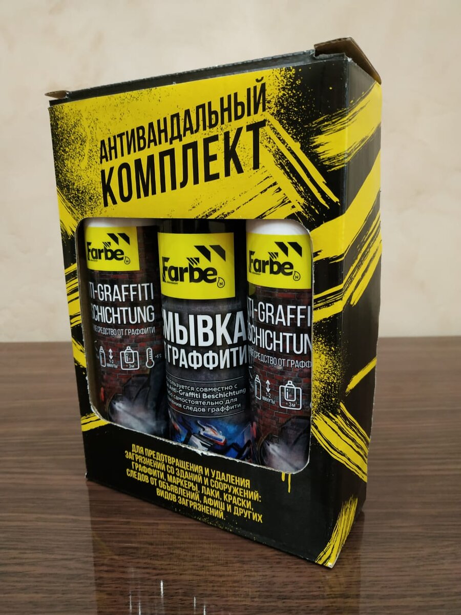 На обработанную средством поверхность не приклеиваются афиши, рекламные носители на клейкой основе, а нанесенные граффити легко смываются водой. Средство распыляется на сухую поверхность с расстояния 10-15 см. в вертикальном положении баллона. При необходимости повторного нанесения время сушки каждого слоя составляет 2 часа. Смывка Farbe Средство, удаляющее граффити и маркеры. Антивандальный набор - тройное воздействие!