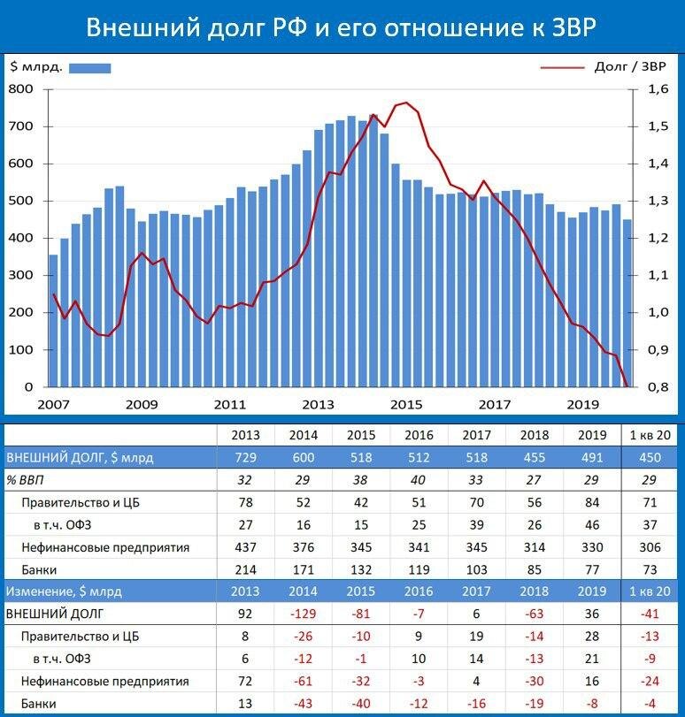 Реклама: https://mebel-msk.com/ - Магазин качественной мебели. БУДУ БЛАГОДАРЕН ЗА ЛАЙК. Внешний долг РФ на конец 1-го квартала составлял $450 млрд, сократившись по сравнению с концом 2019г на $41 млрд. Текущее значение внешнего долга РФ – минимальное с 1-го кв 2009 года. Столь резкое сокращение внешнего долга во многом было связано с девальвацией рубля. Так как часть внешнего долга номинирована в рублях, то ослабление национальной валюты привело к уменьшению значения долга в долларах. Особенно заметно это было в отношении долга правительства – девальвация рубля привела к сокращению задолженности в ОФЗ перед нерезидентами на $9 млрд рублей. Отношение внешнего долга к золото-валютным резервам упало до нового исторического минимума – 0.80. Столь низкий размер внешнего долга России заставляет подумать о более активном использовании внешних заимствований для финансирования дефицита бюджета, который на фоне кризиса и обвала нефтяных цен может достигнуть 4-5 трлн рублей.