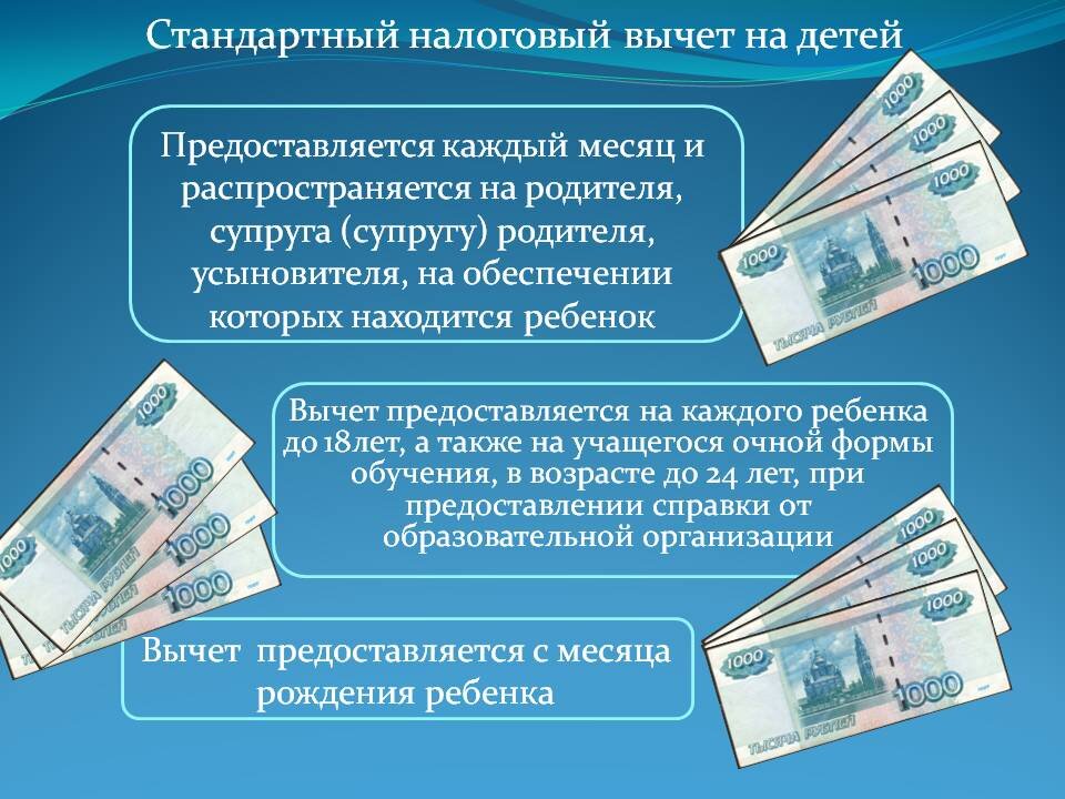 Продолжаем тему налоговых вычетов. Особо актуальную во времена кризиса. В условиях кризиса есть способ пополнить семейный бюджет. Как показывает практика, не все знают, что налог на доходы физических лиц (НДФЛ) можно уменьшить и вернуть в семейный бюджет. В ст. 218 гл. 23 НК РФ говориться о стандартных налоговых вычетах. Поговорим о вычете, который предоставляется ежемесячно и распространяется на налогоплательщиков, на обеспечении которых находится ребенок, попросту, вычет на детей. Применяя который можно уменьшить налоговую базу для исчисления НДФЛ, и соответственно, увеличить свою зарплату "на руки" (условия вычета см. в карусели) Данный вычет предоставляется работодателем по заявлению работника. Но зачастую, работники не заявляют свое право на использование данного вычета. Размеры данного стандартного налогового вычета: * 1 400 рублей - на одного ребенка.; * 1 400 рублей - на второго ребенка; * 3 000 рублей - на третьего и каждого последующего ребенка; * 12 000 рублей - на каждог