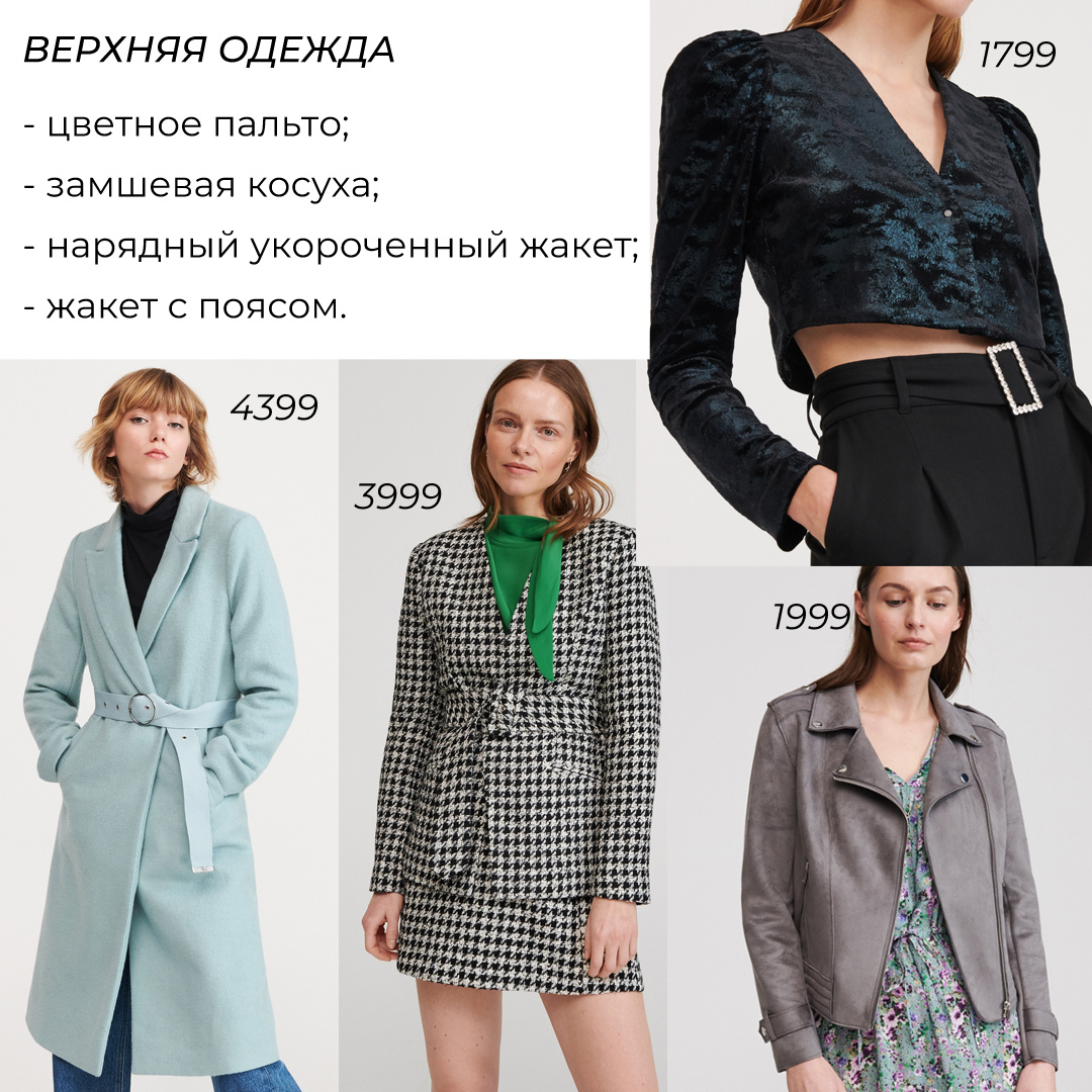 Началась межсезонная распродажа. Даже несмотря на то, что сейчас мы сидим дома. Можно подумать о своем гардеробе зарание. Собрала примеры стильных вещей. Они подойдут как на теплое, так и холодное время года. В следующем посте я составлю капсульный гардероб из вещей в этой подборке. ВЕРХНЯЯ ОДЕЖДА Все мы уже знаем, как выглядит базовое пальто и тренч. Обратите внимание на цветные пальто. Они отлично подойдут на весну. Также можно попробовать внедрить в свой гардероб нетипичные жакеты. ПЛАТЬЯ Очень женственный крой платьев с отрезными расклешенными юбками. Такой крой подойдет практически под любую фигуру. Платья на запахе также подойдет большинству девушек. Если у вас низкий рост, то обратите внимание на длину по колено или по середину бедра. ЮБКИ Мне понравилась плиссированная юбка с вставкой по низу из другой ткани. Смотрится необычно. Юбку плиссе лучше избегать тем, у кого есть небольшой объем внизу живота. Также тем, у кого большой перепад между талией и бедрами. Такая юбка сильно