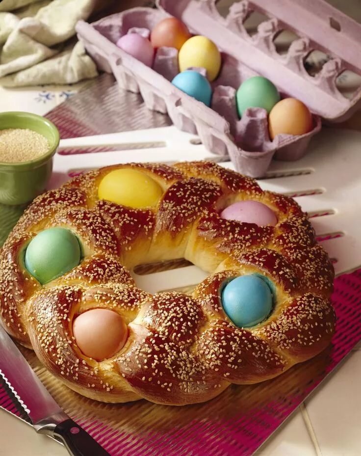 - яйца сваренные в течение 5 минут (сколько гнездышек сделаете, столько яиц вам нужно). Сливочный маргарин или масло растопить, влить молоко, добавить сахар и дрожжи, все хорошо перемешать, добавить муку. Тесто вымесить и поставить на 40 минут в холодильник. Через 20 минут загляните в холодильник, если тесто поднялось, нужно его примять и оставить еще на 20 минут. А уж дальше - что вашей душеньке угодно, то и сотворите! Мы будем творить гнездышки с пасхальными яйцами. Тесто выложить на противень, разделить на части, например на 15 или 18 частей, каждую часть ск