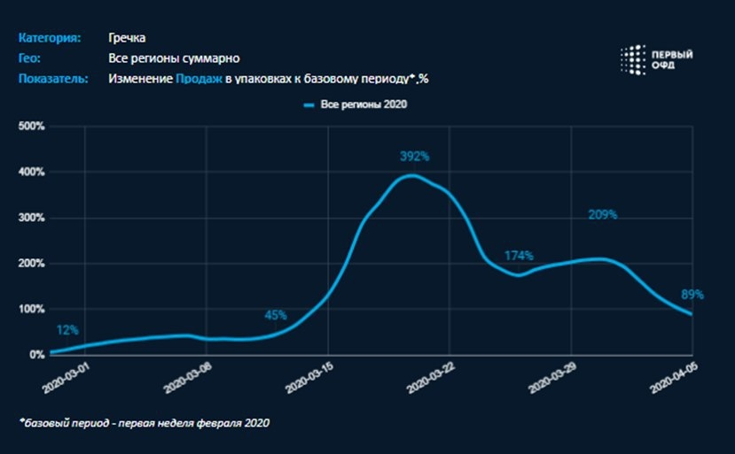 Сегодня вернёмся к “царице полей” всех информационных каналов - Гречке. Актуальный период - 5 апреля 2020 года. Примечание: Начиная с текущей выгрузки мы будем смотреть «Прирост» к базовому периоду, таким образом, базовый период берем за 100% и прирост к нему считаем за вычетом этих 100%. Начиная со второй недели марта произошел резкий прирост продаж в упаковках, который к 20 марта достиг максимума (+392% к базовому периоду). В течение следующей недели спрос колебался на уровне +170…+200% к базовому периоду и далее пошёл на спад Подробнее https://ttttt.me/ac1ofd Источник: телеграмм-канал "По данным Первого ОФД" При использовании данных материалов просим вас указывать источник информации.