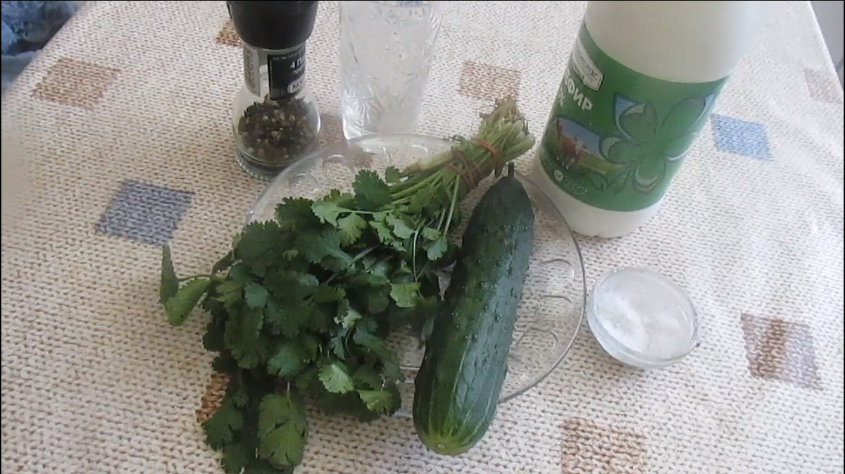 соль и перец - по вкусу ===================================== Первом делом режем зелень, как можно мельче. Резать надо с расчетом на 200 гр. кефира, столовая ложка зелени. И высыпаем в стакан. Через крупную терку, натираем огурец. Столовую ложку натертого огурца выкладываем в стакан. Солим и перчим по вкусу. В стакан с огурцом и кинзой заливаем кефир, 200 грамм кефира. Перемешиваем счательно. После перемешивания, даем настояться 15-20 минут. Коктейль готов к употреблению.