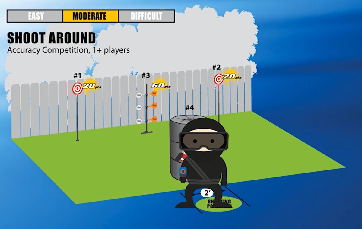 Работа с разных сторон укрытия Это упражнение позволит получить навык быстрой смены положений для работы по мишеням с разных сторон укрытия. Исходное положение игрока - за укрытием. Маркер в положении готовности для стрельбы. На выходе из за укрытия (слева на картинке) игрок делает один выстрел в крайнюю левую мишень (мишень № 1) и 2-3 выстрела в мишень № 3. После чего игрок перемещается на правую сторону укрытия и делает сначала один выстрел по мишени №2 и 2-3 выстрела по мишени №3. Упражнение можно разнообразить количеством и последовательность выстрелов по мишеням. А так же, уходя после каждого выстрела за укрытие. Прогресс в упражнении определяется результативностью попаданий по мишеням и временем на его исполнение.