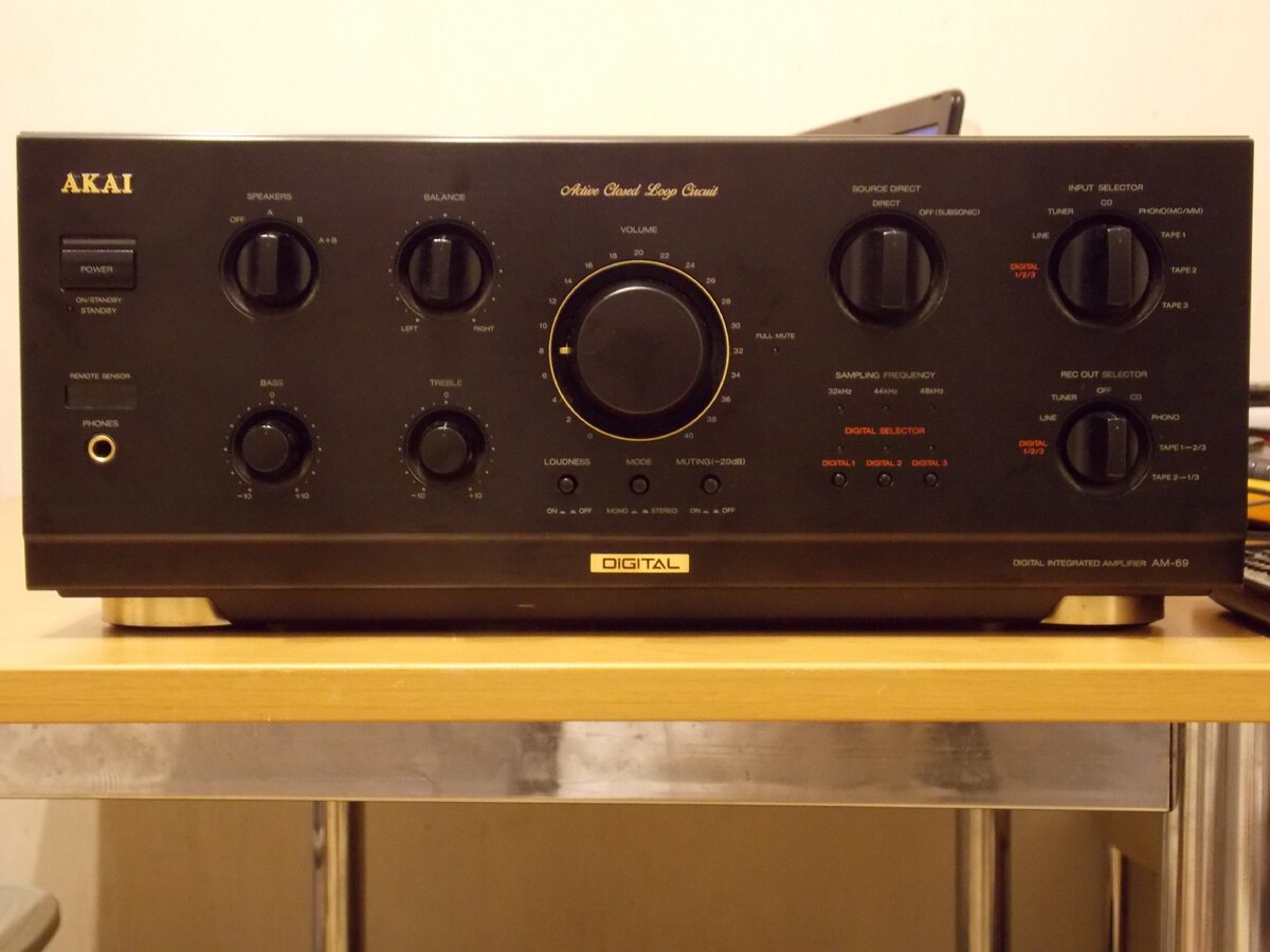 Akai AM-69 верхний в модельном ряду усилителей Akai 1993-1996 годов. Стоимость около 700$ в середине 90-х. На борту ЦАП PCM-69 18 бит/32-44.1-48 кГц с 8-ми кратной передискретизацией, 7 аналоговых входов и 3 цифровых (2 коаксиальных, один оптический). Селектор входов реализован на галетнике, но переключается с пульта - он моторизованный, как и громкость. Есть режим Dirесt, пускающий сигнал в обход регуляторов тембра, отключаемая тонкомпенсация, переключение моно\стерео, mute 20 дБ и full mute (только с пульта). Развернутая коммутация для управления тремя магнитофонами, оптический цифровой выход. Кстати, если входная коммутация у усилителя на галетнике, то вся выходная сделана на микросхеме, как цифровая, так и аналоговая. Встроенный корректор RIAA, с переключателем MM\MC на задней панели. Схемотехника у корректора простенькая - дифкаскад на двух полевиках и один ОУ, коррекция в ОООС. Опция, в общем.