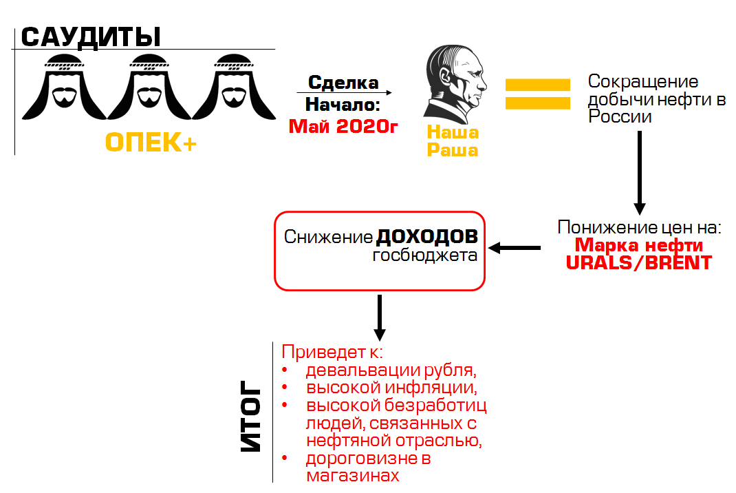 Если прям коротко-чем грозит снижение добычи нефти России: //Мотив нефтяной ценовой войны или согласие России на сокращение добычи: суть... 6 марта 2020г в переговорах с ОПЕК+ российская делегация хлопнула дверью, отказавшись продлевать свое участие в предыдущих договорах с ОПЕК+, желая предположительно сделать нерентабельной добычу сланцевой нефти в США через Роснефть /в статье ранее: США - "Экономический НАЕМНЫЙ УБИЙЦА" венесуэльской "Роснефти" освещала политические отношения между РФ и США в нефтегазовой сфере/, а затем абсолютно лживо обвинила Саудов в том, что они разрушили альянс ОПЕК+. Это вызвало чрезвычайное негодование у арабов, которые объявили ценовую войну, быстро нарастили добычу и стали вытеснять Россию из ее рыночных ниш, в том числе в Европе, предлагая свою нефть с гигантскими скидками. Результат переговоров: //Ситуация выходит на другой уровень... Условия новой сделки обсудились на заседании G20. Это, значит, фактически у России появились международные обязательст