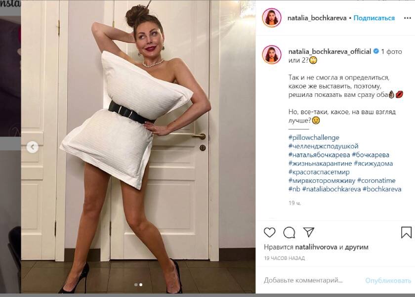 Флешмоб с подушками #PillowChallenge или #QuarantinePillowChallenge придумали две Instagram-блогерши из Швеции. Они выложили свои фотографии с привязанными к телу подушками, которые крепились на талии ремнем и напоминали короткие коктейльные платья. Спустя некоторое время флешмоб докатился до России. В нём приняли участие как звёзды, так и самые обычные люди. Мы сделали небольшую подборку фотографий для тех, кто пропустил этот челлендж. Актриса Наталья Бочкарева Источник Instagram Натальи Бочкаревой Российская фигуристка-одиночница Аделина Сотникова Источник Instagram Аделины Сотниковой Вызов Аделины принял фигурист Алексей Ягудин, который подошел к идее креативно - надел парик и сапожки на высоком каблуке. Источник Instagram Алексея Ягудина И если кто-то воспринял это как фан, то жена футболиста Павла Погребняка Мария Погребняк подошла к флешмобу ответственно и сделала, на наш взгляд, самые стильные фотографии. Источник Instagram Марии Погребняк Не знаем умышленно или нет, но деко