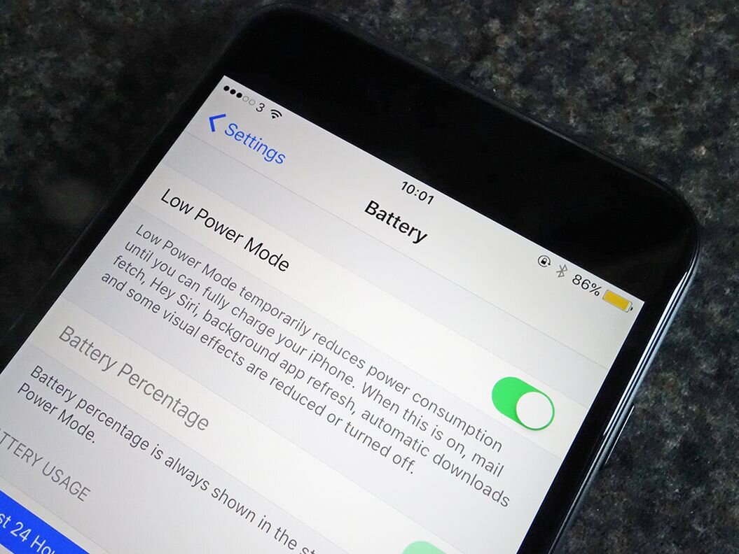 На устройствах Apple есть режим низкого энергопотребления в разделе Настройки > Батарея. Можно включить его вручную или заставить активироваться, когда уровень заряда падает до 20%. В этом режиме ограничиваются фоновые процессы, вроде проверки электронной почты и прослушивания голосовых команд.