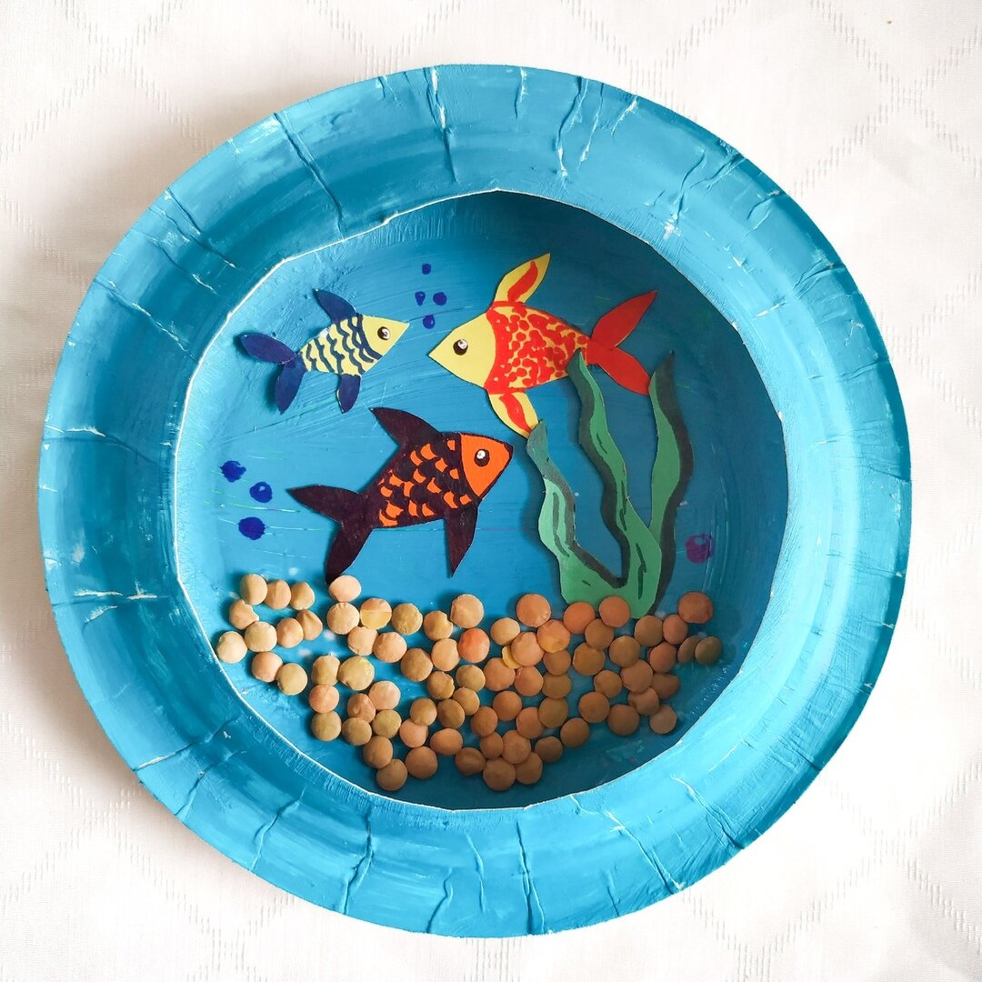 Материалы: Одноразовая картонная тарелка (2 шт.), цветная бумага или картон, ножницы, клей ПВА (или горячий клей), чечевица (можно использовать горох, фасоль или мелкую крупу), фломастеры или цветные карандаши, краски (гуашь). Как сделать: Для начала подготовим основу. Если ваша картонная тарелка подходящего цвета, то вы этот шаг пропускаете. Возьмите одну картонную тарелку и покрасьте её в синий или голубой цвет. Вторую тарелку, при желании, тоже можно покрасить, но только с наружной стороны. После того, как краска высохнет, возьмите ту тарелку, которая была покрашена с внешней стороны, и вырежьте середину (см. фото 2) Теперь займёмся деталями! Из цветной бумаги или картона вырежьте обитателей и наполнение аквариума: рыбок, водоросли, ракушки… Всё, что захотите! Не забудьте украсить ваших рыбок узорами! Когда всё будет готово, можно будет приступить к соединению всех деталей в единое целое. Итак, на целую тарелку, на нужный участок, нанесите клей ПВА и сверху посыпьте круп