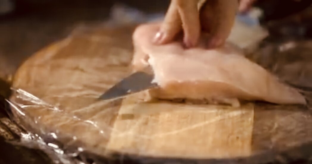 - Разрежьте куриные грудки пополам вдоль. И после отбейте каждую половинку через пищевую пленку .