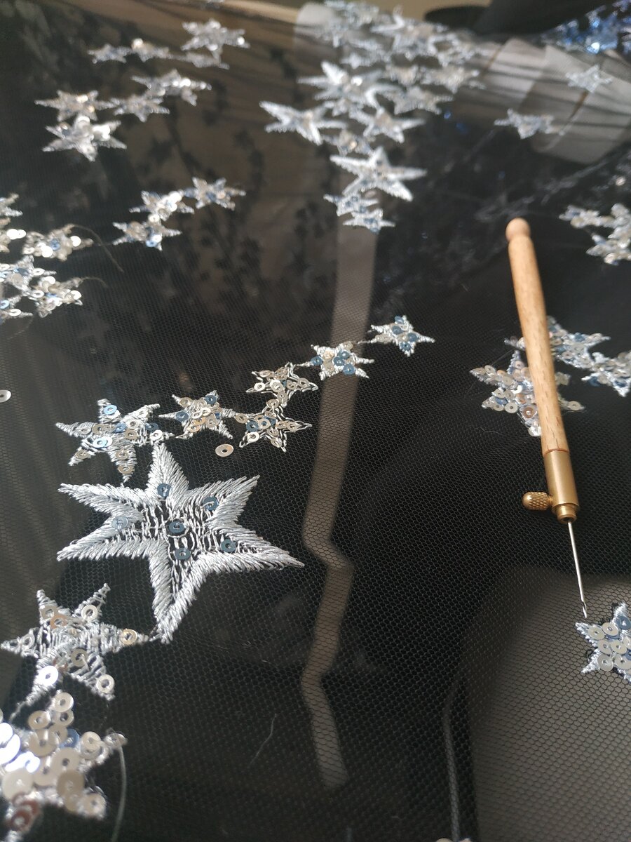 На этот раз это было платье полностью усыпанное мелкими звездочками. Это платье молодой девушки, которая хотела добавить блеска. Она отдала его в ателье, чтобы они расшили его пайетками. Но дело в том, что они отпарили платье, что привело к тому, что все пайетки свернулись. Нужно было быстро и