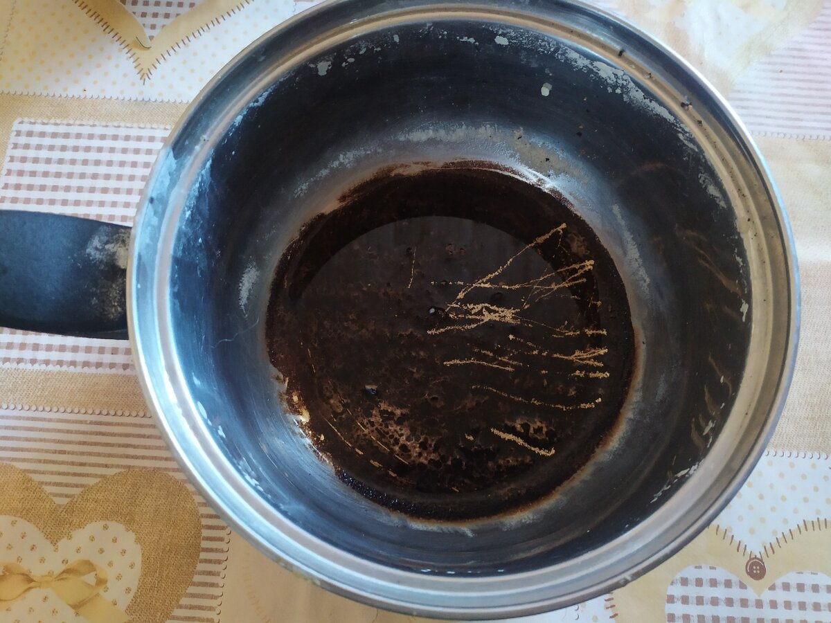 Вчера , не зная, чем заняться во второй половине дня, просматривая ленту Дзена, увидела рецепт торта на сковородке. Фото выглядело очень аппетитно - много тонких коржей, пропитанных кремом. Рецепт был не очень сложный, все продукты были в наличии. Чтобы не страдать от скуки, решила испытать новый для меня рецепт, несмотря на то, что с утра уже напекла пирожков. Я доверилася автору, замесила тесто и занялась приготовлением заварного крема. Были сомнения, что варить его надо все-таки на водяной бане. Но, т. к такого указания автор не дал, стала варить на огне, постоянно помешивая. Крем стал пригорать. Уже потом прочитала в других рекомендациях по его приготовлению, что надо использовать посуду с антипригарным покрытием. А я взяла ковш из нержавейки. Вот результат. Отмачивала со всякими средствами, толку никакого. Как Вы думаете, можно его спасти или шансов нет? Печь коржи на сковороде тоже было непривычно. Автор указал, что смазывать маслом не надо. Да, на новой сковороде с антиприг